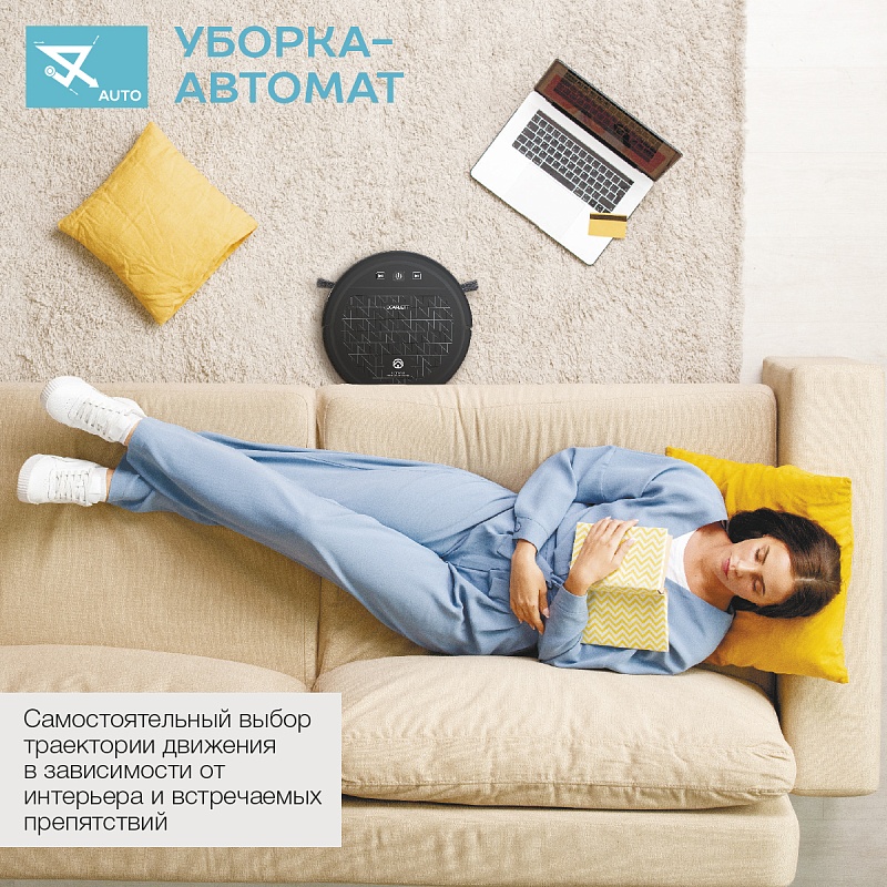 Прибор оснащен функциями автоматического выбора различных траекторий движения при уборке, энергосбережения при блокировке и встроенными датчики для обхода препятствий и защиты от падения.