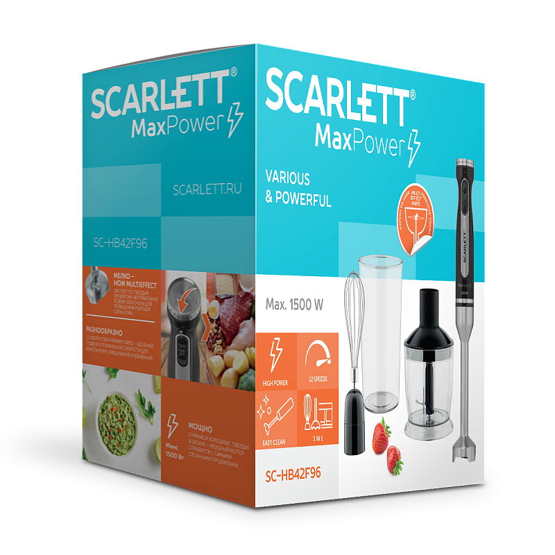 Scarlett SC-HB42F96 – современный погружной блендер, предназначенный для измельчения и смешивания продуктов. Он работает быстро и эффективно.