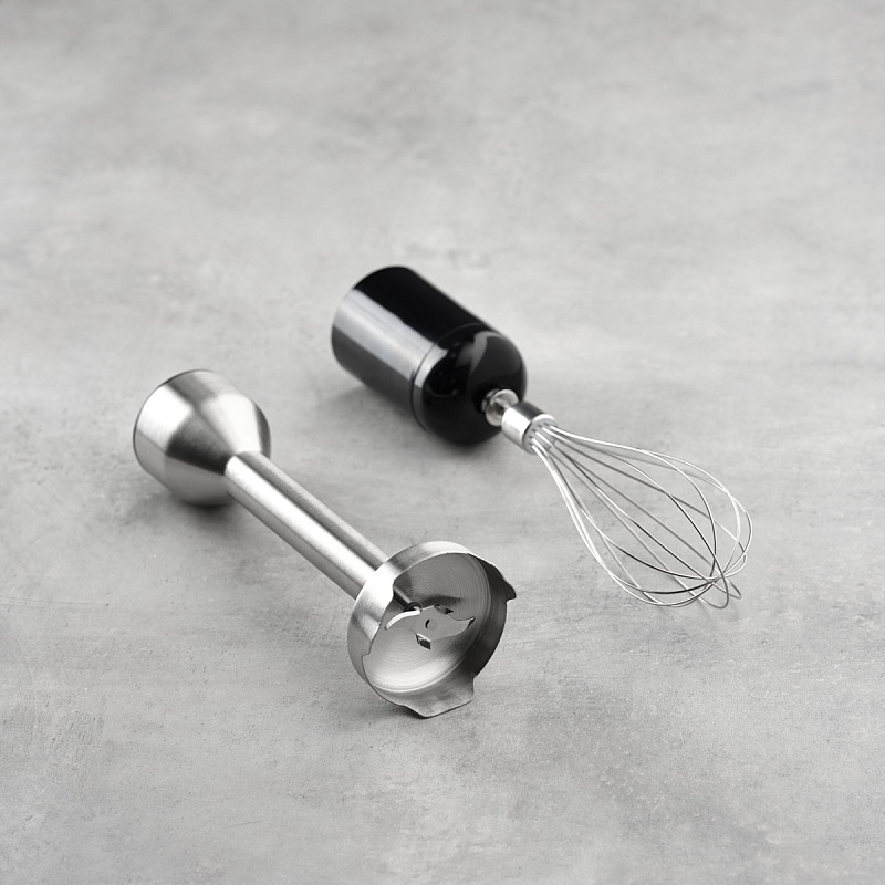 В комплекте к блендеру прилагаются насадка для измельчения и смешивания, мини-измельчитель, объём которого составляет 600 мл, металлический венчик для взбивания и мерный стакан, объемом 600 мл.