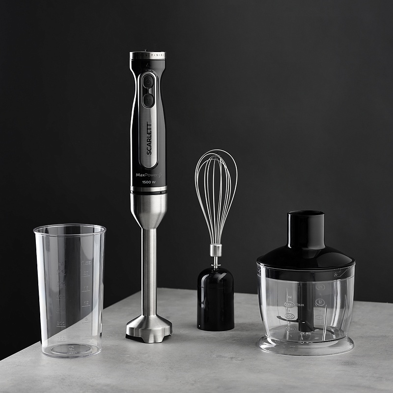 Аксессуары в комплекте: венчик, измельчитель, мерный стакан