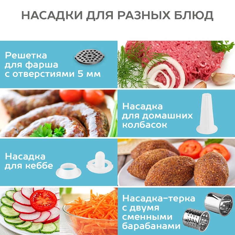Насадки легко отмываются от жира и грязи. Прорезиненные ножки помогают мясорубке оставаться устойчивой на столешнице.