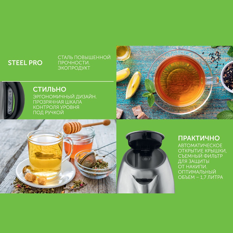 Электрический чайник объемом 1,7 л и мощностью макс 2200 Вт оснащён закрытым нагревательным элементом, автоматическим открытием крышки, и съемным фильтром для защиты от накипи. Корпус прибора выполнен целиком из высококачественной нержавеющей стали. Удобная мерная шкала под ручкой позволит контролировать уровень воды. Система многоуровневой безопасности SAFE WORK сделает эксплуатацию прибора проще и комфортнее – автоотключение при закипании, защита от включения без воды. Удобный отсек для хранения электрошнура.