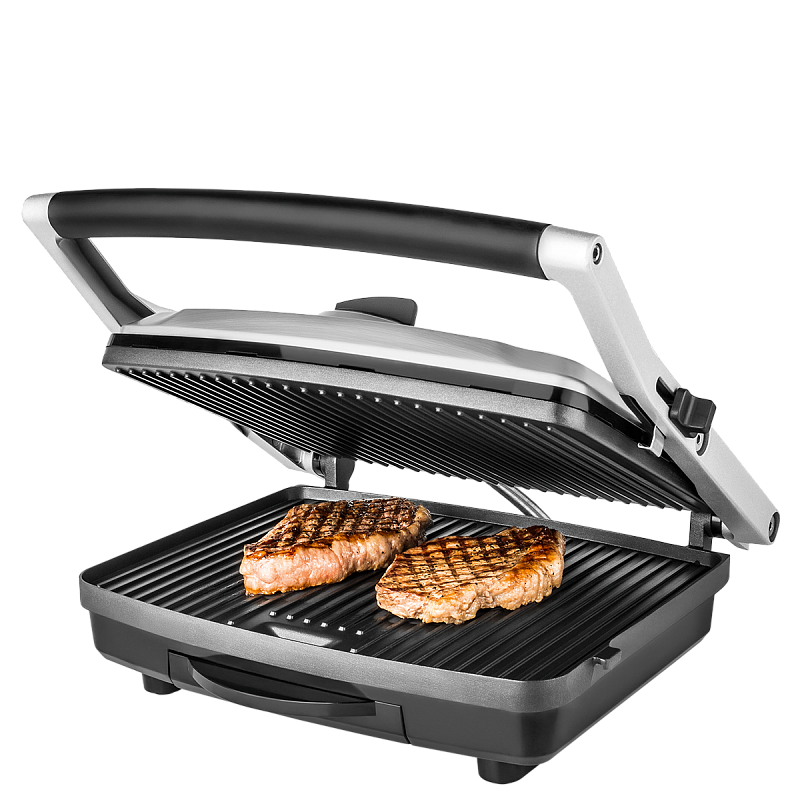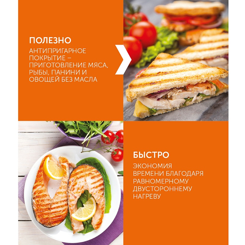 Мощный гриль 2200 Вт с двумя терморежимами и антипригарным покрытием рабочей поверхности для максимально комфортного процесса приготовления.